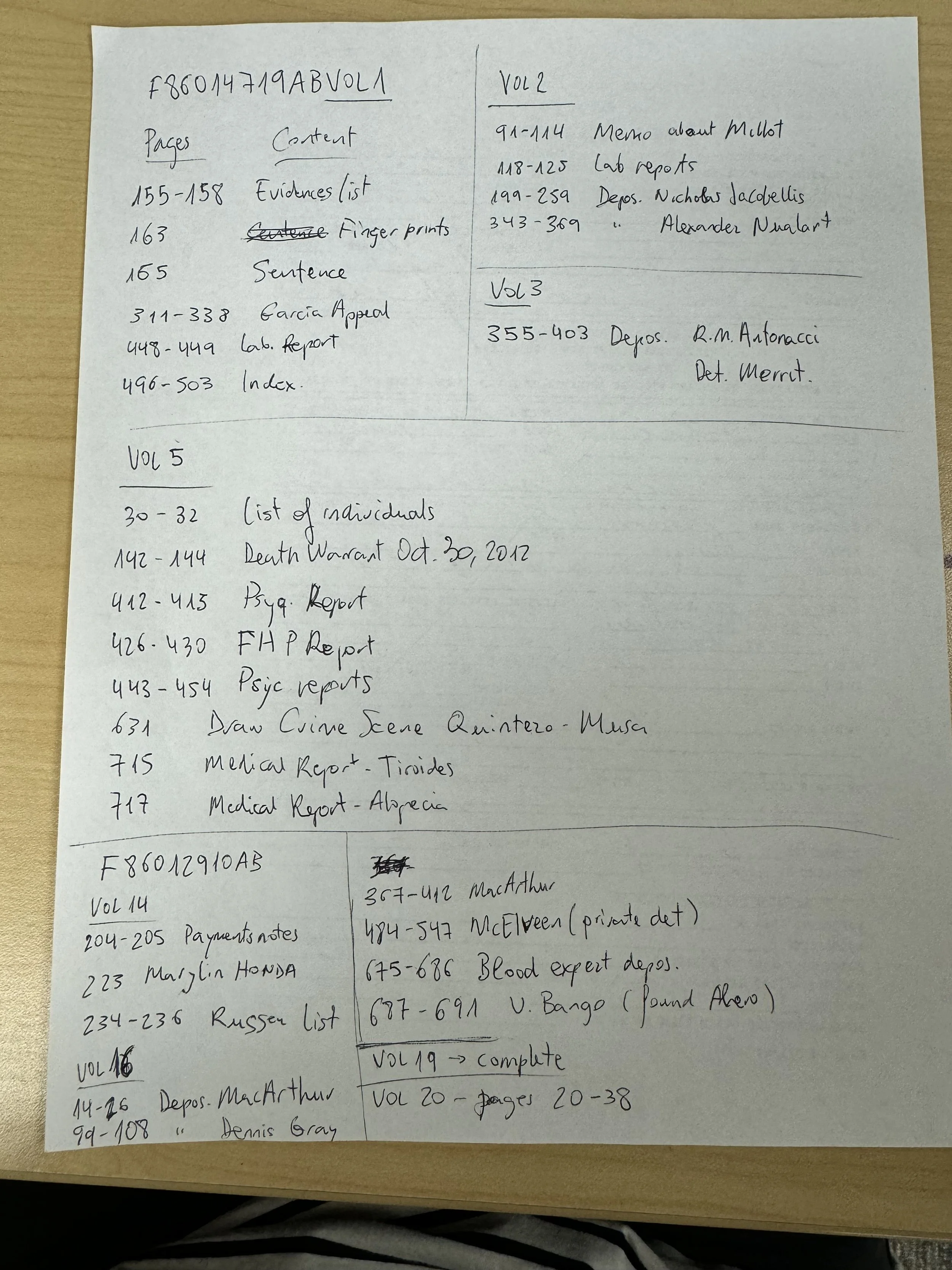 Luckily, the Miami court had digitized case F86012910A. “F” stands for felony, “86” for the year. The file is split into about twenty volumes, each ranging from 300 to 2,000 pages. We had to go through the material right there, on a Jurassic computer running Windows Photo Viewer—page by page. I got scolded for daring to open Acrobat. That 64MB RAM wonder froze instantly. We had to reboot and resign ourselves to writing down, by hand, the page numbers that mattered.